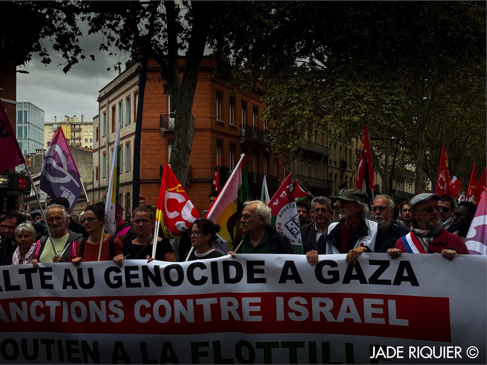 Déterminée, la foule scande : « Nous sommes tous des enfants de Gaza ». Et son message est clair : « Halte au génocide à Gaza. Sanctions contre Israël. Soutien à la flottille » indique la banderole de tête portée par des représentant-es de la LDH, CGT, FSU, Solidaires, Solidarité Palestine Toulouse, des politiques telles la députée Anne Stambach-Terrenoir et son collègue Christophe Bex (NFP). Une flottille, certes internationale, mais où ont pris place trois toulousains : Cédric Caubère, secrétaire général de la CGT 31, Khaled Benboutrif, médecin, et François Piquemal, député de la Haute-Garonne du Nouveau Front populaire.