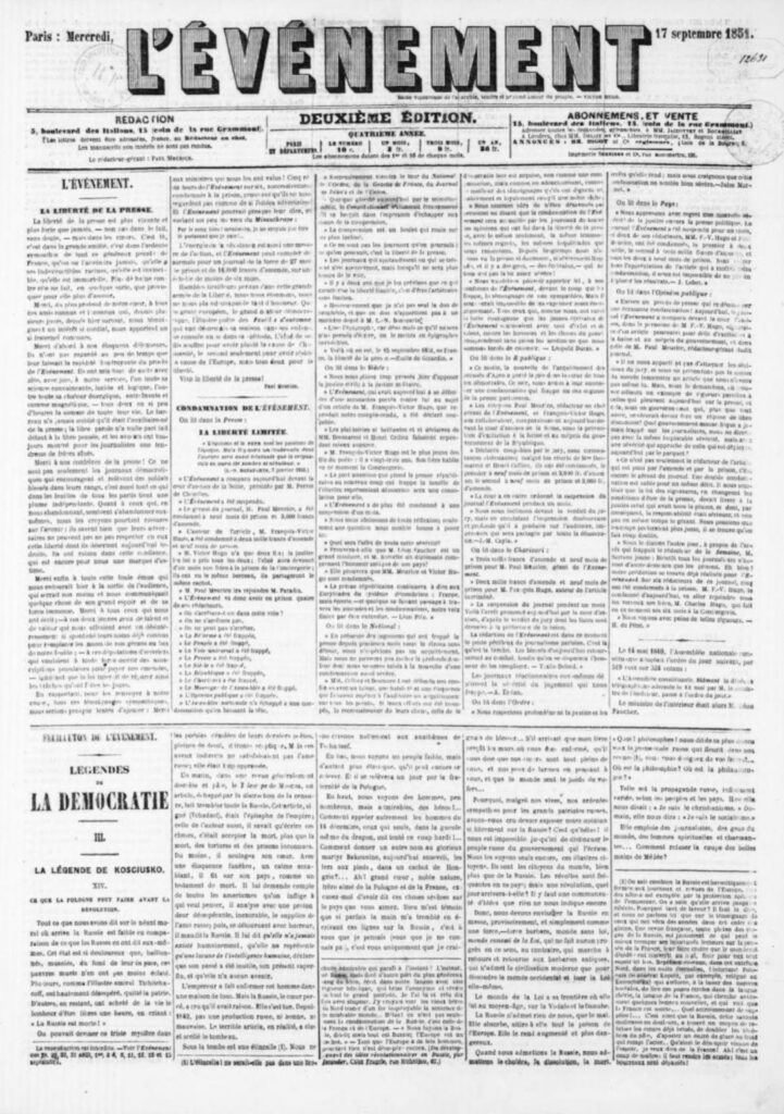 Robert Badinter connaît ce rôle de la presse, il connaît les publications du journal « L’Événement » que Victor Hugo fonde en 1848 avec ses amis Paul Meurice et Auguste Vacquerie, et ses fils Charles et François-Victor, soutenus par Émile de Girardin. Ce journal fait un malheur, est le seul à être vendu le soir par les jeunes crieurs de rue, après la fin des délibérations de l’Assemblée (50 000 ventes en mai 1850). Quand il le faut, Victor Hugo apporte lui-même à l’imprimerie les comptes rendus des débats. Ses discours, on peut en retrouver le texte dans Actes et Paroles, mais ils ont marqué surtout le quotidien politique et social. Ce ne sont pas seulement des déclarations d’opinion, ils sont ancrés dans le vécu, notamment les trois discours sur la liberté de la presse, liés à l’arrestation des écrivains, celui sur le Congrès de la Paix, peu auparavant celui sur la misère, après sa visite avec Blanqui des miséreux des Caves de Lille, et surtout celui sur la peine de mort le 15 septembre 1848, alors que le journal publie un article sur le refus des charpentiers de construire une guillotine.