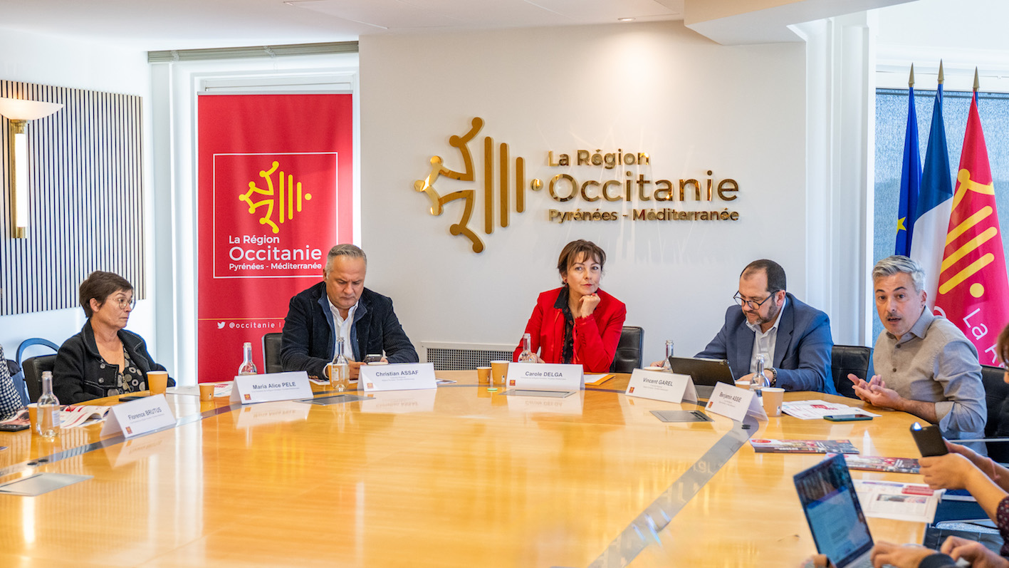 Photo. conférence de presse, bilan mi mandat, hôtel de Région, Montpellier, 24 octobre 2025