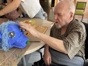 Entourés par une équipe engagée dans le projet, les participants sont souvent fragiles, âgés de 80 à 100 ans, parfois en fauteuil roulant ou atteints de troubles cognitifs. Mais l’effort est totalement partagé et Sophie Laporte s’en réjouit : « Ils sont capables de faire des choses et sont alors très fiers d’eux. Les artistes apportent leurs compétences, mais on voit aussi les résidents sous un œil nouveau. Les jeunes qui viennent régulièrement les rejoindre sont hyperactifs et fiers d’eux aussi. Tous découvrent leur capacité créative, dans le rire, l’invention, le bonheur. » Avec un sourire de plus elle cite Van Gogh : « Il n’y a rien de plus réellement artistique que d’aimer les gens. » La restitution des ateliers s’est faite le 10 octobre dans une petite salle de l’EHPAD. En novembre une rencontre réunira les participants autour d’un goûter et de la vidéo du spectacle. Sophie, qui vit toujours sa quête personnelle, Le sourire de Mona (spectacle donné récemment à Bayssan), espère bien poursuivre cette démarche partagée : « L’art fait du bien, les activités manuelles, l’improvisation… On apporte la créativité, une nourriture pour le cerveau. »