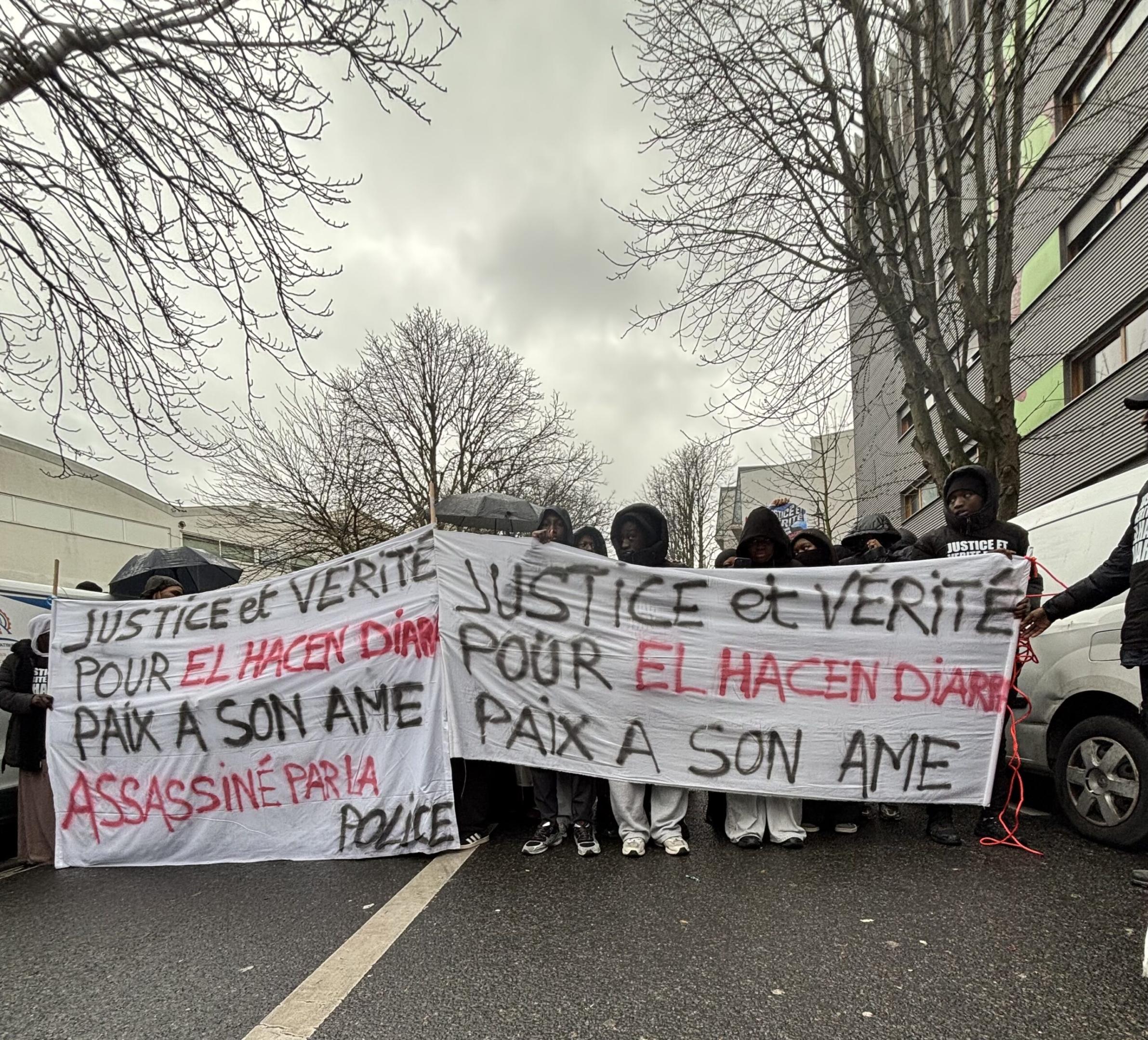 Vers 15h, la marche démarre menée par le camion des associations. La famille de la victime se tient dignement en tête derrière la banderole sur laquelle est inscrit « justice et vérité pour El Hacen Diarra, assassiné par la police, paix à son âme ». Durant plus de trois heures, les tambours et les chants ont résonné dans les rues du 20e arrondissement, se répercutant jusqu’au commissariat où est décédé le jeune homme de 35 ans : « Justice pour El Hacen Diarra et toutes les victimes des violences policières, siamo tutti antifascisti, nous sommes tous des enfants d’immigrés, police partout justice nulle part, pas de justice, pas de paix… ».