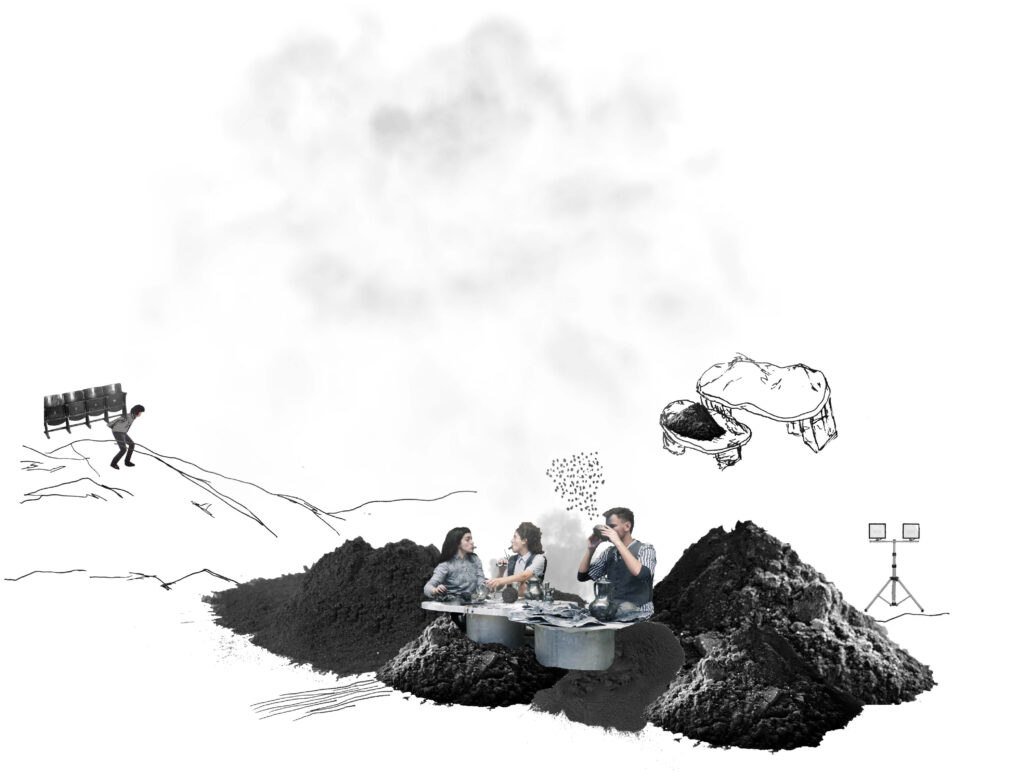 C’est ce que vient contredire frontalement Matière grise. La mise en œuvre de cette pièce est pourtant très spectaculaire à l’œil. Richement costumés, les trois performeur.euses sont installé.e.s autour d’une table d’abondances. On croirait à quelque tableau de cour, baroque sans retenue, maquillé, perruqué, lustré, doré, en même temps que teinté du fantastique de matières intrigantes, visqueuses, fondantes, subtilement dégoulinantes, aux teintes troublantes, quelque part entre le volcanique et le pétrolifère.