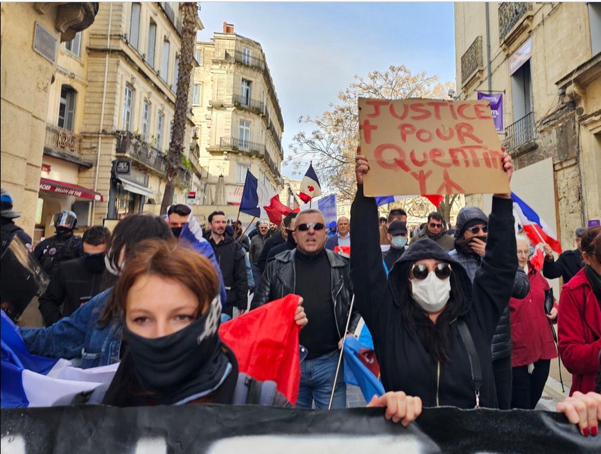 Dimanche 15 février, après d’interminables jours sous les gouttes, c’était l’occasion d’aller boire un verre en terrasse, de retrouver la lumière et un peu de bleu du ciel. À la terrasse des cafés places du Marché aux fleurs, les montpelliérain.e.s retrouvent progressivement le sourire. Quand arrive un groupe d’identitaire. Ils sont une cinquantaine tout de noir vêtu, gantés, certains cagoulés et réclament justice après le drame ayant entrainé la mort du militant identitaire Quentin, à l’issue d’un affrontement entre deux bandes à Lyon.