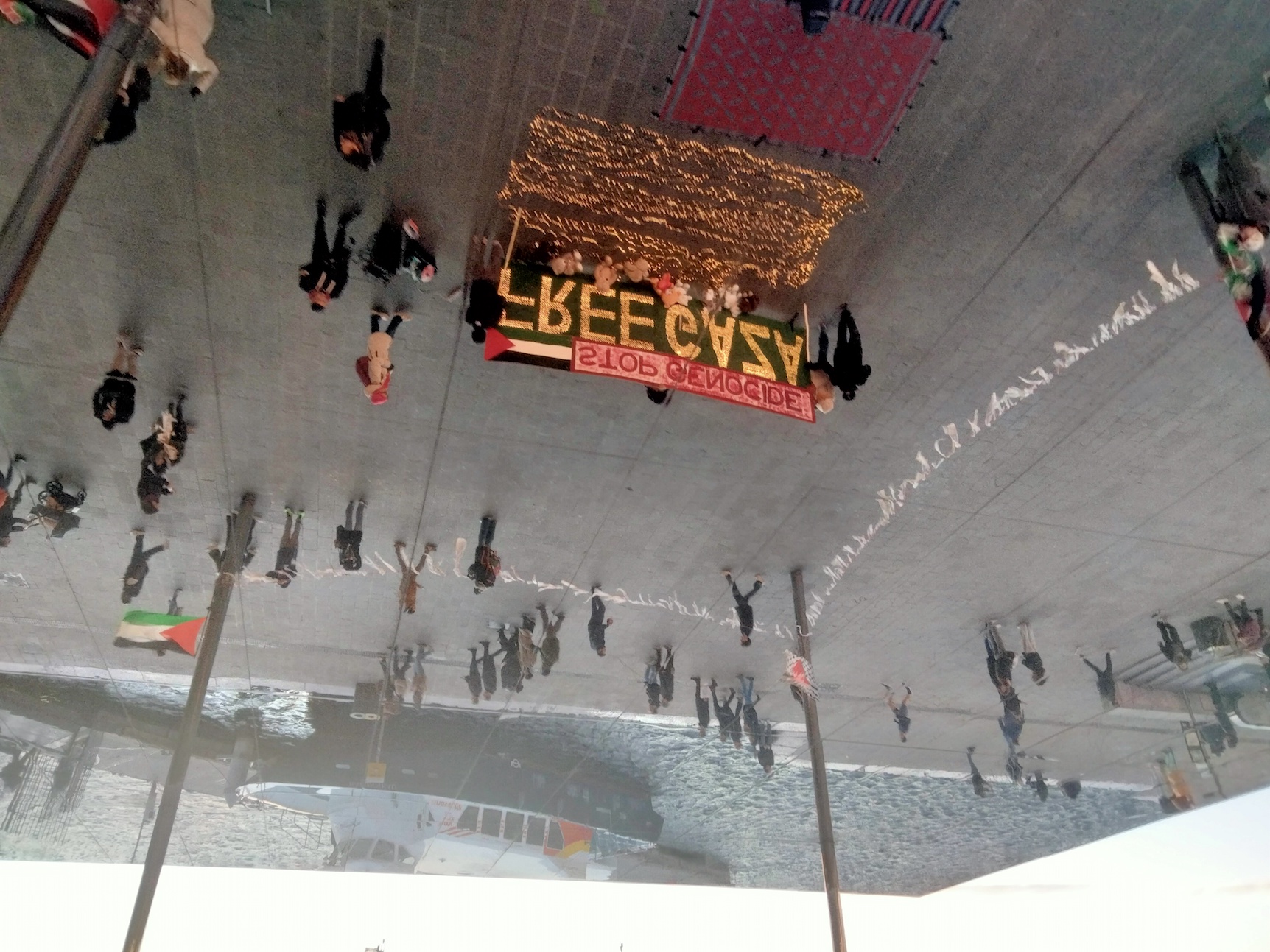 Photo. Une veillée pour Gaza sous l’ombrière du vieux port à Marseille le samedi 14 Février 2026. Photo Brigitte Challande altermidi