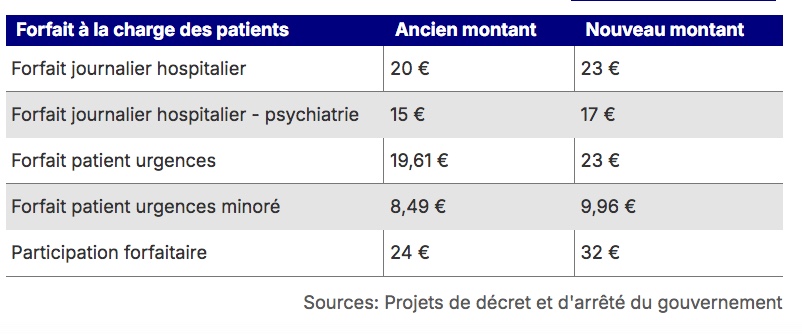 Les « forfaits » facturés aux patients en cas d’hospitalisation ou de passage aux urgences augmente de 100% passant de 2 à 4 € dès le dimanche 1er mars. Le « forfait journalier hospitalier », la somme dont s’acquittent les patients hospitalisés au titre des « frais d’hébergement et d’entretien », grimpe de 20 à 23 € par jour. En psychiatrie, le forfait qui était fixé à 15 € passe à 17 €. Après un passage aux urgences, sans hospitalisation, le forfait laissé à la charge du patient passe également de 19,61 € à 23 €.