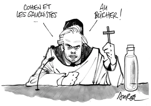 Illustration. Audiovisuel public : À l’Assemblée, la commission d’enquête d’Alloncle déraille. Dessin d’Aurel dans Le Canard enchaîné.