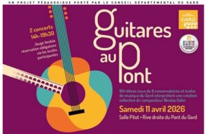 Le Conseil départemental du Gard lance « Guitares au Pont », un nouveau dispositif pédagogique inscrit dans le Schéma départemental des enseignements artistiques 2023-2028. Ce projet rassemble 104 élèves guitaristes issus de huit conservatoires et écoles de musique du territoire. La restitution aura lieu samedi 11 avril 2026 à la Salle Pitot, au Pont du Gard, avec deux concerts programmés à 14h et 19h30. Les élèves y interpréteront une création originale du compositeur Nicolas Kahn, présent pour l’occasion, après plusieurs mois de travail collectif engagé depuis octobre 2025 et ponctué de répétitions à Aramon et Sommières. Pensé pour valoriser la pratique collective et renforcer les liens entre structures d’enseignement artistique, « Guitares au Pont » vise à offrir aux élèves une expérience scénique dans des conditions professionnelles. Porté par le Département et initié par l’École de musique intercommunale du Pays de Sommières, ce projet contribue à dynamiser le réseau musical local tout en favorisant les échanges entre jeunes musiciens.